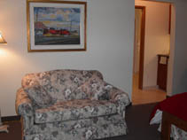 Fabulous water view suite, first floor, wheelchair accessible, queen size bed and cozy love-seat that pulls out into a twin bed, private bathroom with wheelchair shower. Maximum room occupancy